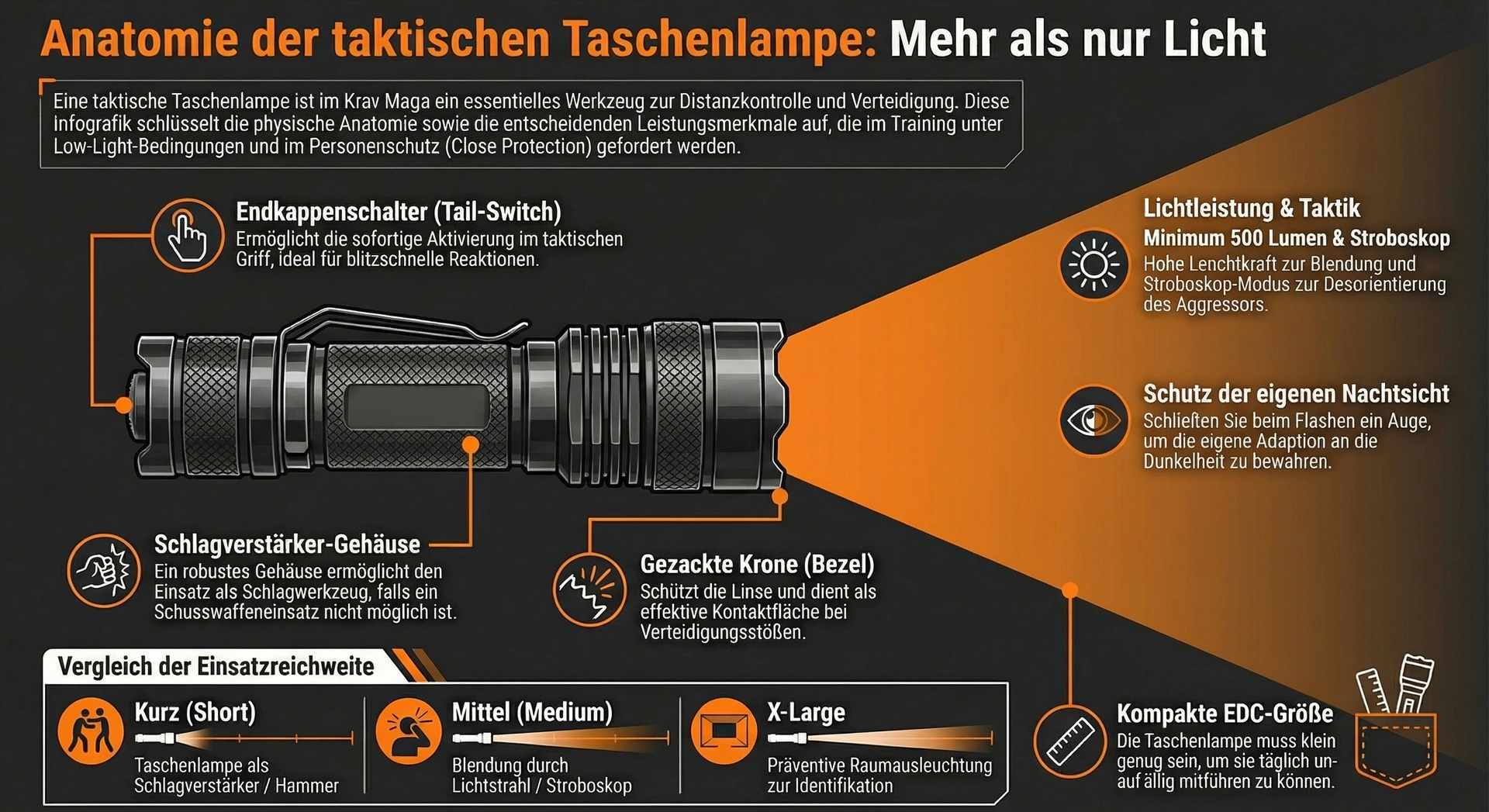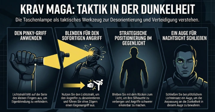 Im Krav Maga nutzen wir die Taschenlampe nicht nur, um unseren Weg zu beleuchten, sondern als aktives Mittel zur Selbstverteidigung.