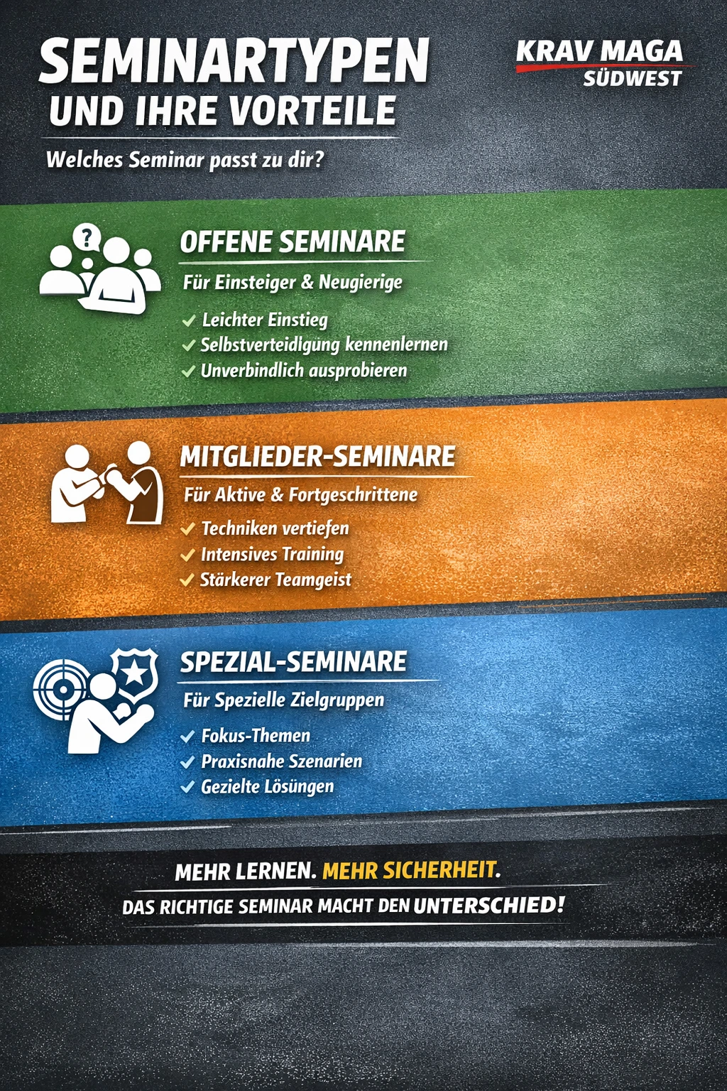 Seminare sind ein zentraler Bestandteil moderner Selbstverteidigungs‑ und Trainingskonzepte. Sie ermöglichen intensives Lernen, schaffen Gemeinschaft und bieten Raum für Themen, die im regulären Training oft zu kurz kommen. Doch Seminar ist nicht gleich Seminar. Je nach Zielgruppe und Inhalt erfüllen sie unterschiedliche Funktionen – und genau das macht sie so wertvoll.
